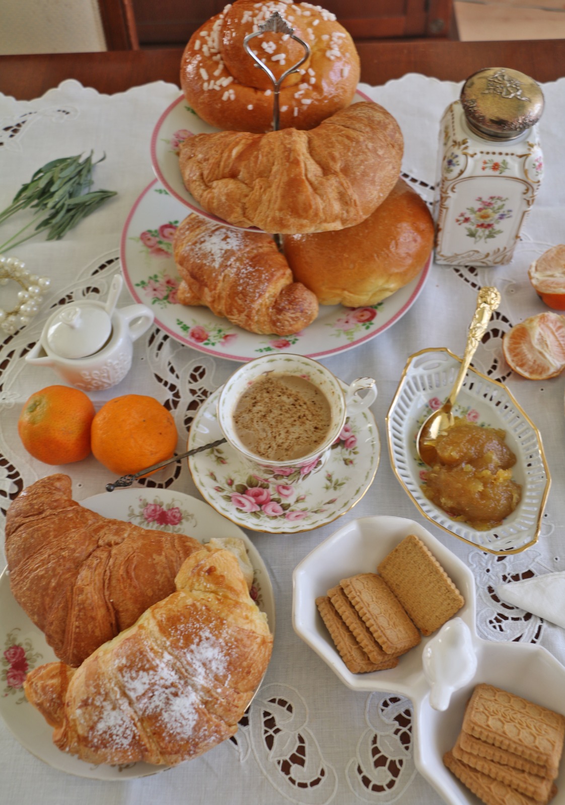 Per una tavola armoniosa, non è necessario apparecchiare con il servizio di tazze Royal Albert (fortunato chi lo possiede), basta una tovaglia pulita e ben stirata – vanno bene anche delle tovagliette all’americana -, delle tazze coordinate con il piattino, nulla di più brutto che le stoviglie spaiate o peggio sbrecciate, il cucchiaino, un coltello per spalmare il burro e/o la marmellata, un cestino per i biscotti o per le brioche, possibilmente armonici almeno nel colore: con il bianco non si sbaglia mai.
