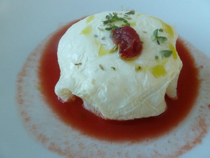La Nuvola di mozzarella viene centrifugata e finita con origano, pomodoro secco, basilico, crostino di pane sotto, imbevuto di spremuta di pomodoro, pesto di basilico e olio extravergine: un piatto fantastico, profondamente meridionale nella sostanza e nei ricordi che regala.