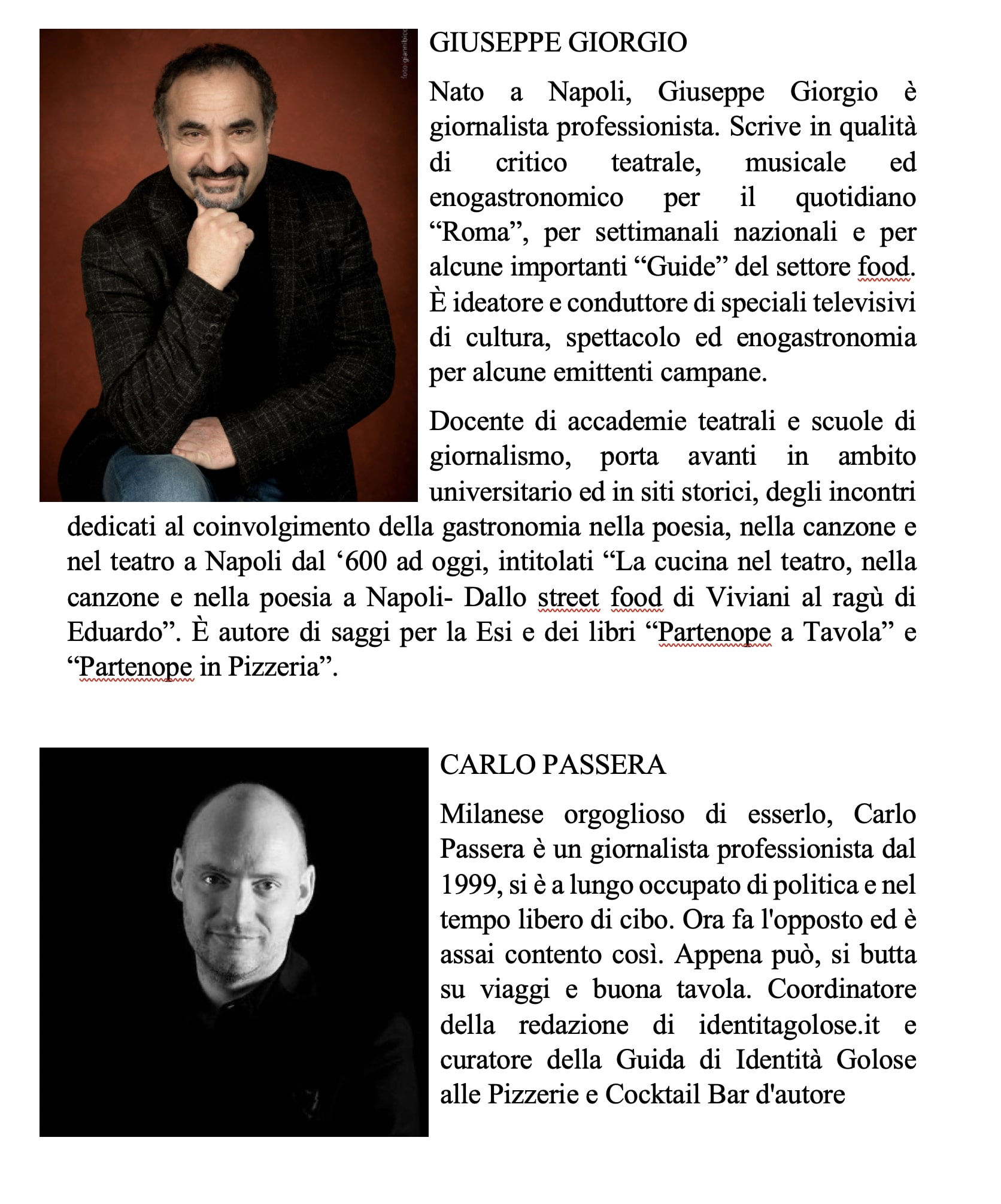 Nato a Napoli, Giuseppe Giorgio è giornalista professionista. Scrive in qualità di critico teatrale, musicale ed enogastronomico per il quotidiano “Roma”, per settimanali nazionali e per alcune importanti “Guide” del settore food. È ideatore e conduttore di speciali televisivi di cultura, spettacolo ed enogastronomia per alcune emittenti campane.