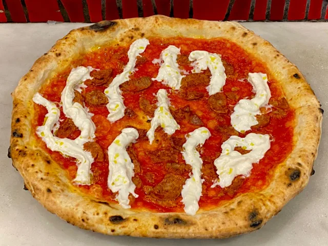 Pizza Diavola: pomodoro san Marzano, fior di latte, ‘nduja di Spilinga e cacioricotta di capra cilentana.