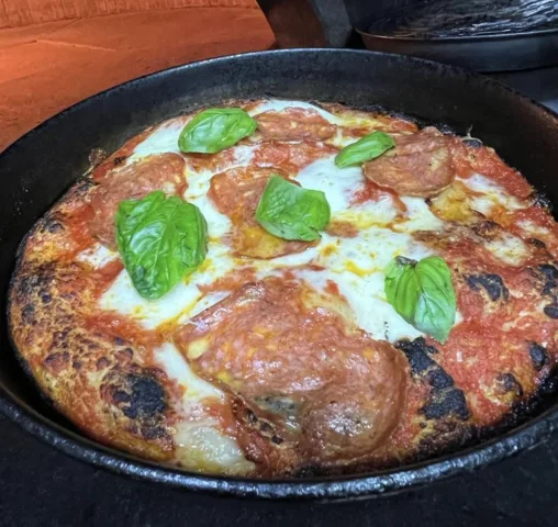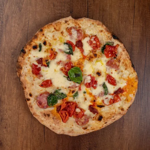 Diavola: pomodoro pelato San Marzano Dop , fior di latte, salame piccante artigianale, basilico fresco.