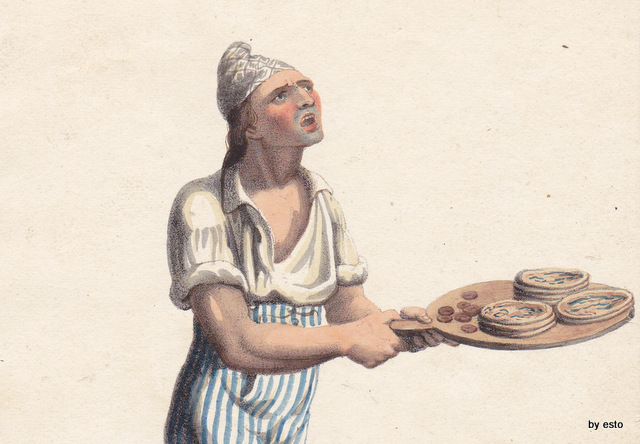 Pizzajuolo ambulante stampa inizio 1800 fonte libro ‘a pizza di Tommaso Esposito ed. L’arca e l’arco