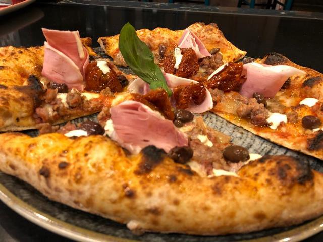 La Capricciosa: salsa di pomodoro, fior di latte, julienne di cuore di carciofi sbollentati homemade con aroma di menta, olive taggiasche appassite al forno fatte in casa, fungo di Parigi a lamelle appena appassiti e, fuori cottura, prosciutto cotto.