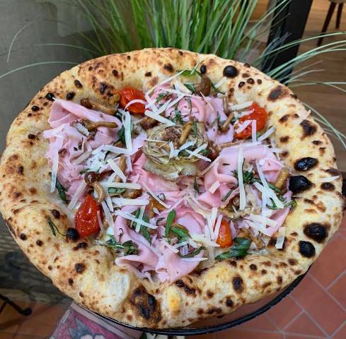 La Capricciosa: pomodoro pelato bio, fior di latte di Agerola, funghi cardoncelli, carciofi grigliati, olive di Gaeta, prosciutto cotto in uscita, olio Evo e basilico.