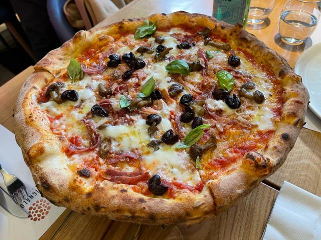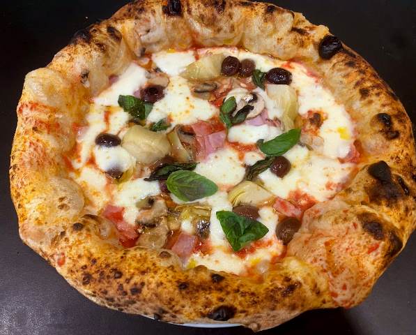 La Capricciosa: pomodoro, doppio fior di latte 100% di latte campano, prosciutto cotto, salame Napoli, funghi, olive nere caiazzane, olio extravergine di oliva del Cilento Dop e basilico fresco.
