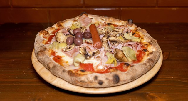 La Capricciosa: pelato bio, fior di latte, prosciutto cotto, wurstel, olive, funghi e carciofi.
