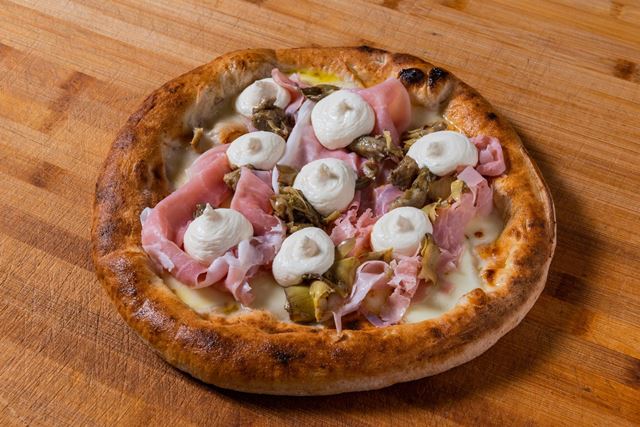 La Capricciosa: cotto artigianale, carciofi saltati, fior di latte dei F.lli Fusco di Agerola e fonduta al Parmigiano Reggiano Dop con 30 mesi di stagionatura.