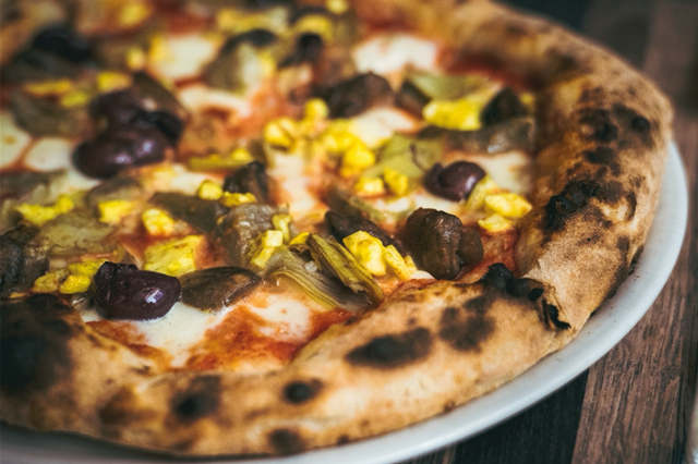 La Capricciosa Campana: pomodoro pelato bio di Casa Marrazzo, fior di latte di Agerola, salamino di maiale sannita, carciofi del Cilento, olive nere caiazzane, caciocavallo di latte nobile e olio extravergine Itran’s Madonna dell’Olivo aggiunto a fine cottura.
