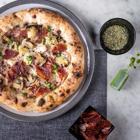 La Capricciosa: culatta cotta, fior di latte a chilometro zero, funghi champignon, bianchetto fresco, olive infornate di Ferrandina, carciofo spinoso di Sardegna saltato, pomodoro secco di Ragusa, olio Evo e basilico fresco bio.
