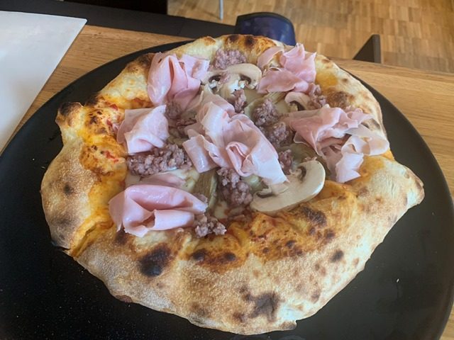 La Capricciosa: base pomodoro (Pomo Gold dell’azienda La Rosina) prosciutto cotto e salame della Macelleria Cillo(Airola, BN), carciofi grigliati, porcini e fior di latte all’uscita, olive caiazzane (Presidio Slow Food) e basilico.