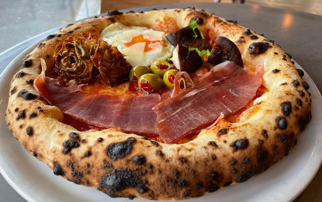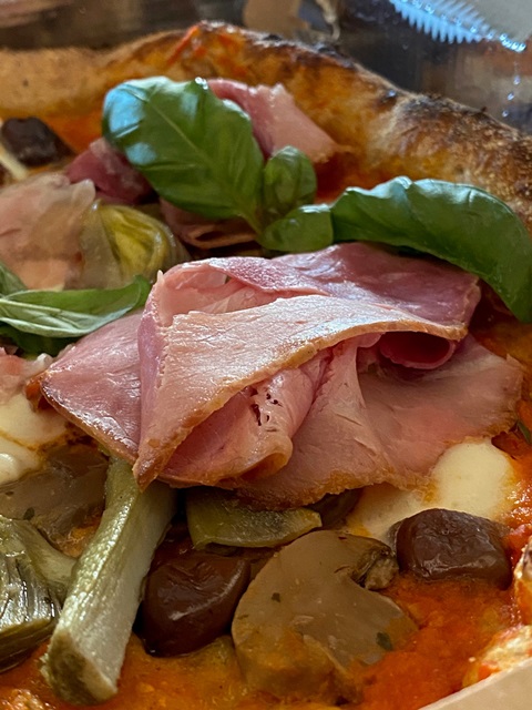 La Capricciosa: pomodoro locale, fior di latte, Prosciutto cotto Santoro, cardoncello, carpaccio di carciofo bianco, oliva locale secca e uovo di quaglia.