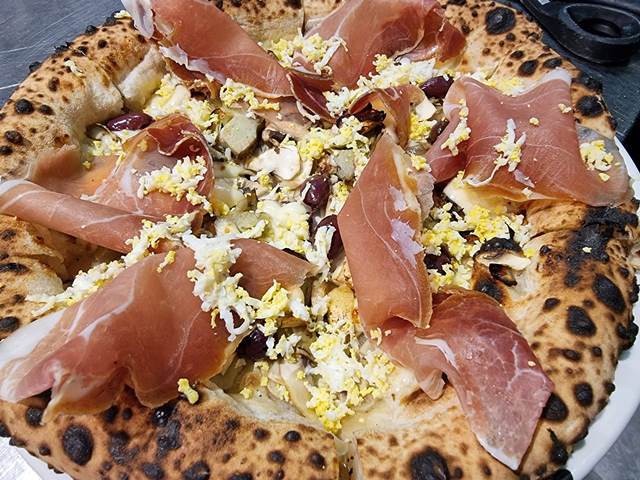 La Capricciosa: fior di latte, carciofini alla brace, olive taggiasche, funghi champignon, polvere d’uovo e prosciutto crudo.