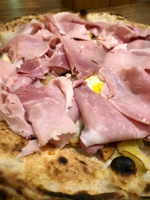 La Capricciosa a modo nostro: fior di latte ragusano, patate a sfoglia, funghi cardoncelli, uovo, spalla cotta di San Secondo.