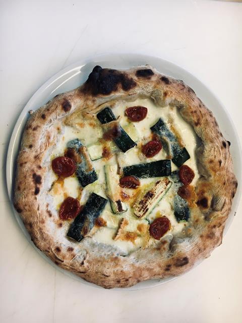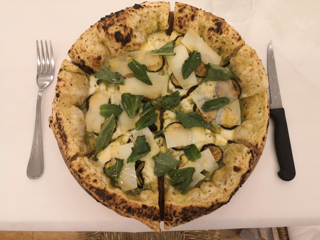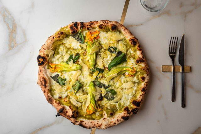La Nerano ma non troppo: salsa alla Nerano, zucchine, fiori di zucca, fior di latte di Vico Equense, Provolone del Monaco Dop, basilico e olio evo dell’Oleificio Moscato di Federico Moscato (Campagna, SA)