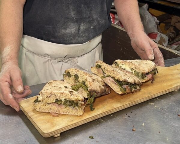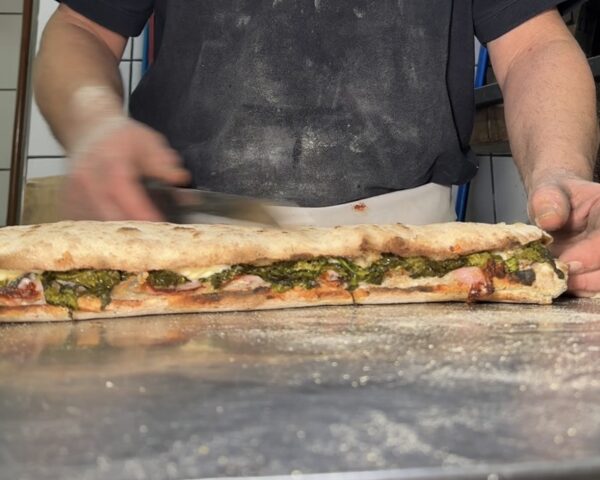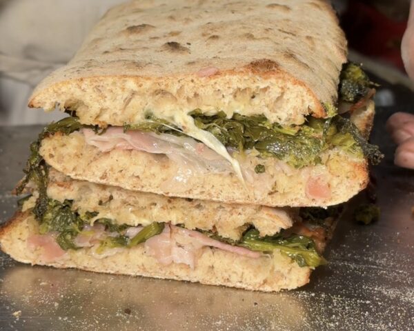Pubblichiamo la vera ricetta del Panuozzo di Gragnano, donataci dall’Associazione Pizza & Panuozzo di Gragnano per la tutela, valorizzazione e promozione del Panuozzo di Gragnano, in questo caso farcito con friarielli, pancetta arrotolata e provola affumicata dei Monti Lattari, che si sposa alla perfezione con il vino Gragnano. Un abbinamento che celebra la tradizione gragnanese, portando a tavola gusto, territorio e convivialità in ogni morso e in ogni sorso. Il panuozzo è uno dei piatti più tipici della tradizione gragnanese e ha contribuito allo sviluppo economico della città. Negli anni ’80 a Gragnano c’erano poche pizzerie; oggi il successo del panuozzo ha favorito l’apertura di numerosi locali, diventando un vero simbolo della città. Andare a Gragnano per il panuozzo è ormai un rito gastronomico, simile a recarsi a Napoli per la pizza napoletana, ed è un prodotto a base di farina di grano tenero, acqua, sale e lievito di birra fresco. La farcitura può variare secondo la fantasia del produttore e i gusti del consumatore. All’atto dell’immissione al consumo, il panuozzo si presenta come un panino lungo circa 20–25 centimetri, farcito e sottoposto a una seconda cottura. La produzione è esclusiva del comune di Gragnano, in provincia di Napoli, città famosa per le sue eccellenze gastronomiche, tra cui la pasta e il panuozzo. Nonostante sia l’ultima delle specialità gragnanesi ad affermarsi, le sue origini affondano nel noto “cibo da strada”, con tracce già visibili negli scavi dell’area archeologica di Pompei. La storia documentata del panuozzo a Gragnano risale agli anni ’80.