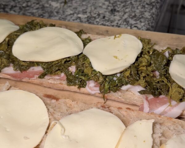 Per questa farcia sono stati utilizzati i friarielli ripassati in padella con olio e peperoncino, la pancetta arrotolata e la provola affumicata dei Monti Lattari.