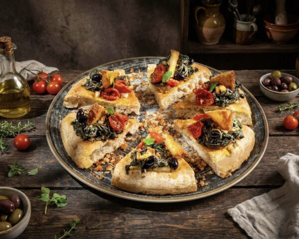 Sulla base, cotta a doppia tecnica vapore/legna, viene adagiata caciotta leccese fusa, poi completata all’uscita dal forno con paparina soffritta in olio EVO, aglio e peperoncino, olive Celline salentine, pomodori semi-dry, crumble croccante di pane di grano duro fritto e una fogliolina di mentuccia selvatica. Chiude un filo d’olio extravergine d’oliva a crudo. Il risultato è una pizza rustica ed elegante, profumata, equilibrata, profondamente territoriale.