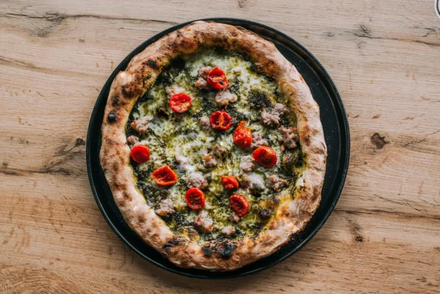 Il cuore è di salsiccia e la crema di broccoletti reca intensità, mentre la provola di Agerola, il pachino confit e la polvere di pane completano il topping.
