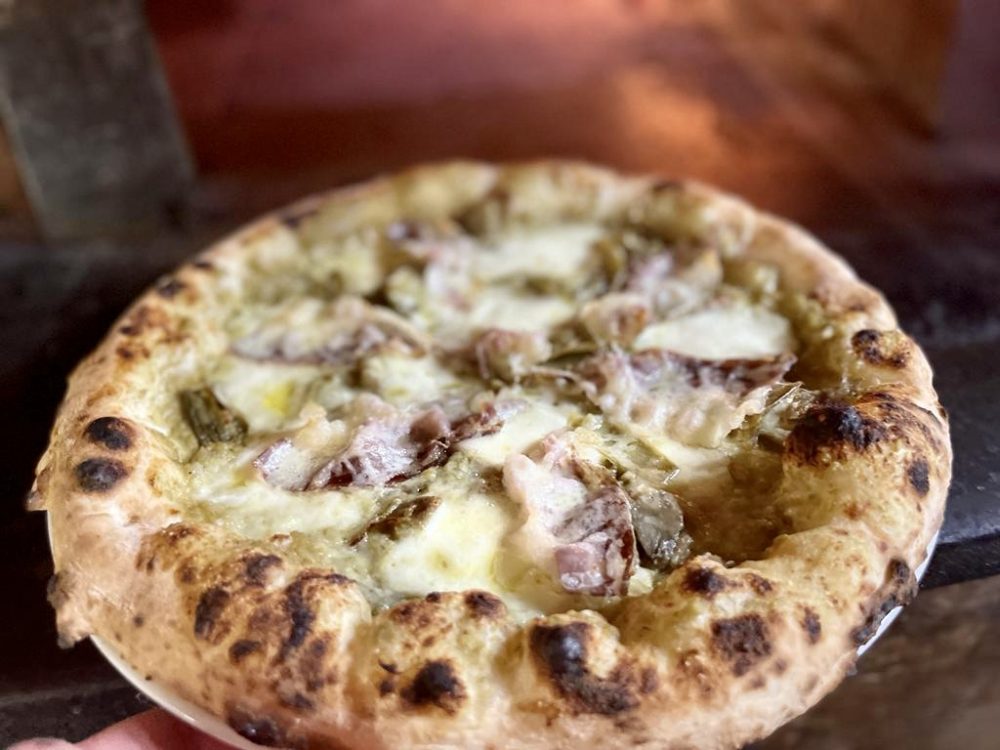 Pizza della settimana: Pizza con vellutata di carciofo, pancetta tesa e pecorino di Millenium Giovanni Civitillo abbinata alla Falanghina Campi Flegrei Cantine del Mare
