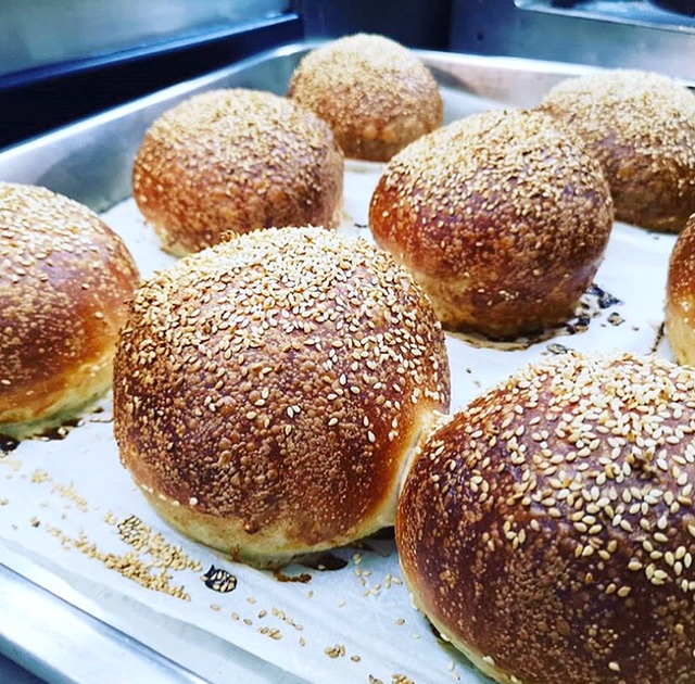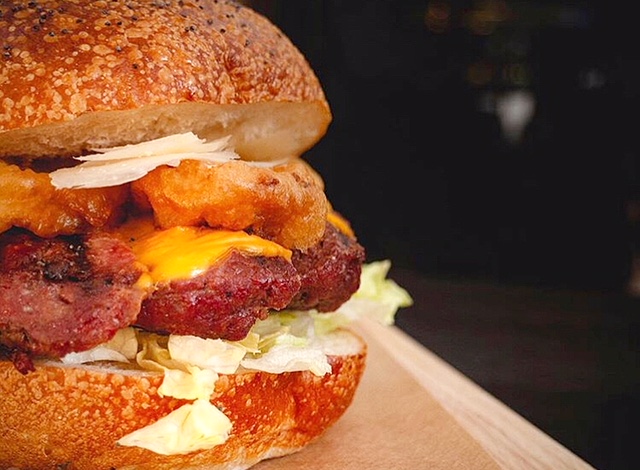 Pharina – Panino di hamburger di manzo, crema di cacio e prpe e anelli di cipolla