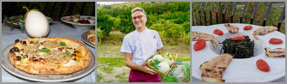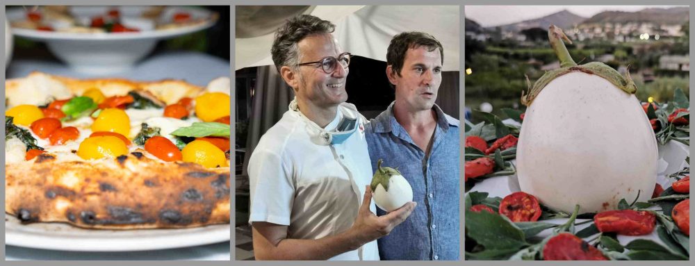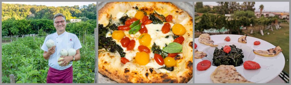“Abbiamo sperimentato, nella farcia, le foglie di questa pianta che viene considerata – dice Ciro Coccia – parente stretta della Quinoa. Sto lavorando da un po’, già dalla Dea Bendata, alla valorizzazione di antiche cultivar, di prodotti autoctoni del territorio, alla ricerca dei sapori di una volta. Con la nascita di questo format estivo presso le Terme Stufe di Nerone è nata anche la voglia di esplorare i prodotti coltivati nel terreno fertile dei Campi Flegrei. Con Ernesto Colutta del Giardino dell’Orco siamo accomunati proprio dal desiderio di conoscere il meglio di questa terra vulcanica e sabbiosa insieme. Lui, con la costante ricerca portata avanti con l’orto e io con lo sviluppo di condimenti equilibrati, sani e capaci di suscitare anche ricordi o nuove esperienze di gusto. In questo periodo abbiamo potuto scoprire l’uso delle piante selvatiche in cucina e sulla pizza e la versatilità della melanzana bianca che abbiamo utilizzato cotta alla brace. Con l’impiego del Farinello mi sento un po’ Napoleone che pare lo utilizzò per ricavarne farina per il suo esercito in tempi di provviste scarse”.