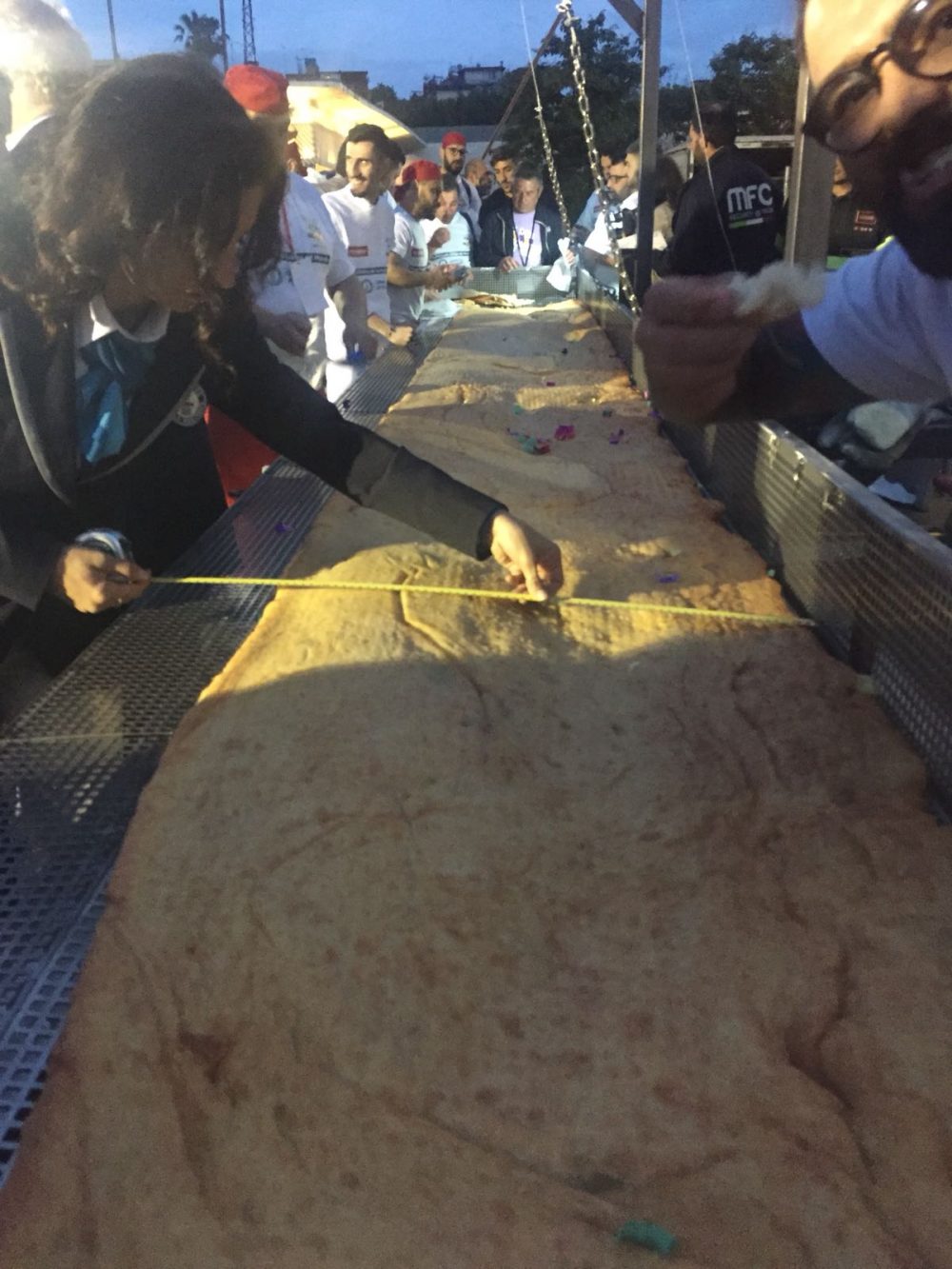 Un’impresa per la quale è stata appositamente realizzata una friggitrice di 7,5 metri di lunghezza. Per compierla sono stati utilizzati 1500 litri di olio forniti da Olitalia, 123,5 chili di impasto per circa 83 chili di farina doppio zero Caputo, 50 chili di fiordilatte, 15 chili di ricotta, 7 chili di pomodoro pelato, 15 chili di ciccioli, basilico e pepe.