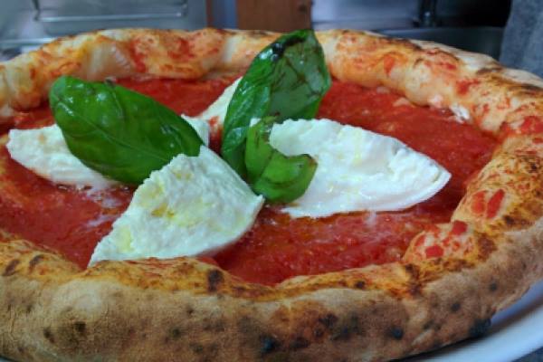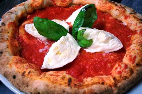 Pizza con fondo di pomodoro, basilico, cornicione ripieno di ricotta, grana grattugiato, olio EVO e mozzarella di bufala campana tagliata in quattro e aggiunta dopo la cottura.