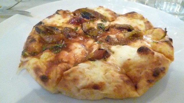 Pizza con Torzella di Villaricca, Fiordilatte e salsiccia di Tramonti, olio extravergine di oliva della azienda Famiglietti (Paternopoli, Avellino)