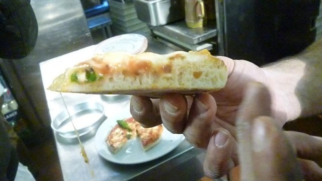 Ma veniamo alle pizze. Dagli assaggi, che vi mostriamo nelle immagini che seguono, è emerso che la pizza cotta al Pizz’ino è molto diversa da quella classica napoletana cui siamo abituati. La sola apposizione della corona produce un effetto sorprendente e la pizza risulta ancora più soffice e vaporosa. Tra le peculiarità: sembra accogliere in maniera del tutto inedita il condimento e gli ingredienti (selezionati, assolutamente, dal bravo Gino Sorbillo autore anche dell’impasto) ed è eccellente anche fredda. Provare per credere.
