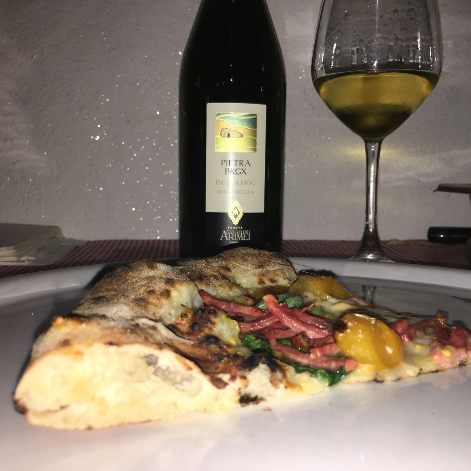 Al Bistrot sono state proposte due varianti di pizze più classiche personalmente realizzate dal pizzaiolo ischitano in trasferta Ivano Veccia: la margherita di Corbara (margherita con i pomodorini di Corbara) e la Raggio di Sole (salame e pomodorini del piennolo). Le due pizze erano in abbinamento a Pietra Brox Ischia Bianco DOC della Tenuta Giardini Arimei a Forio d’Ischia di proprietà della famiglia Muratori.
