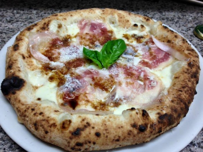 Pizza con fior di latte e pancetta arrotolata artigianale, grattugiata di pecorino romano e colatura di vincotto.