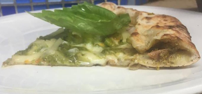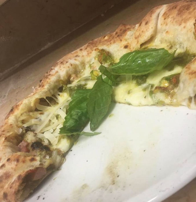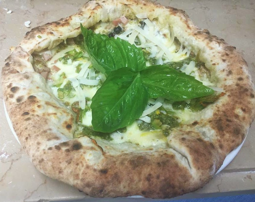 Questa pizza ha la particolarità di avere il cornicione ripieno di crema di pistacchio, mortadella e provola. La base del disco è condita con fior di zucca saltati, aglio e olio, provola, scaglie di parmigiano e pesto a crudo.