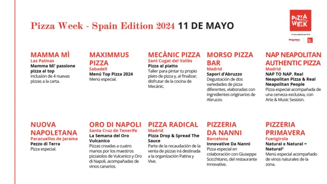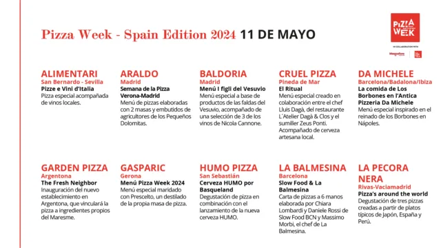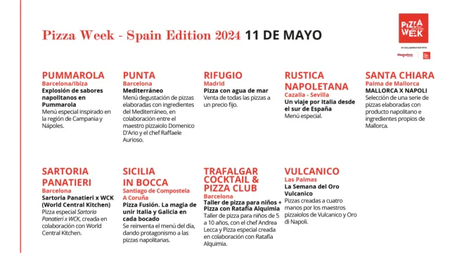 Pizza Week Spagna, gli appuntamenti dell’11 maggio con 50 Top Pizza 10/5/2024 660 LETTURE Inizia la Settimana della Pizza in Spagna di 50 Top Pizza! Ecco cosa succede