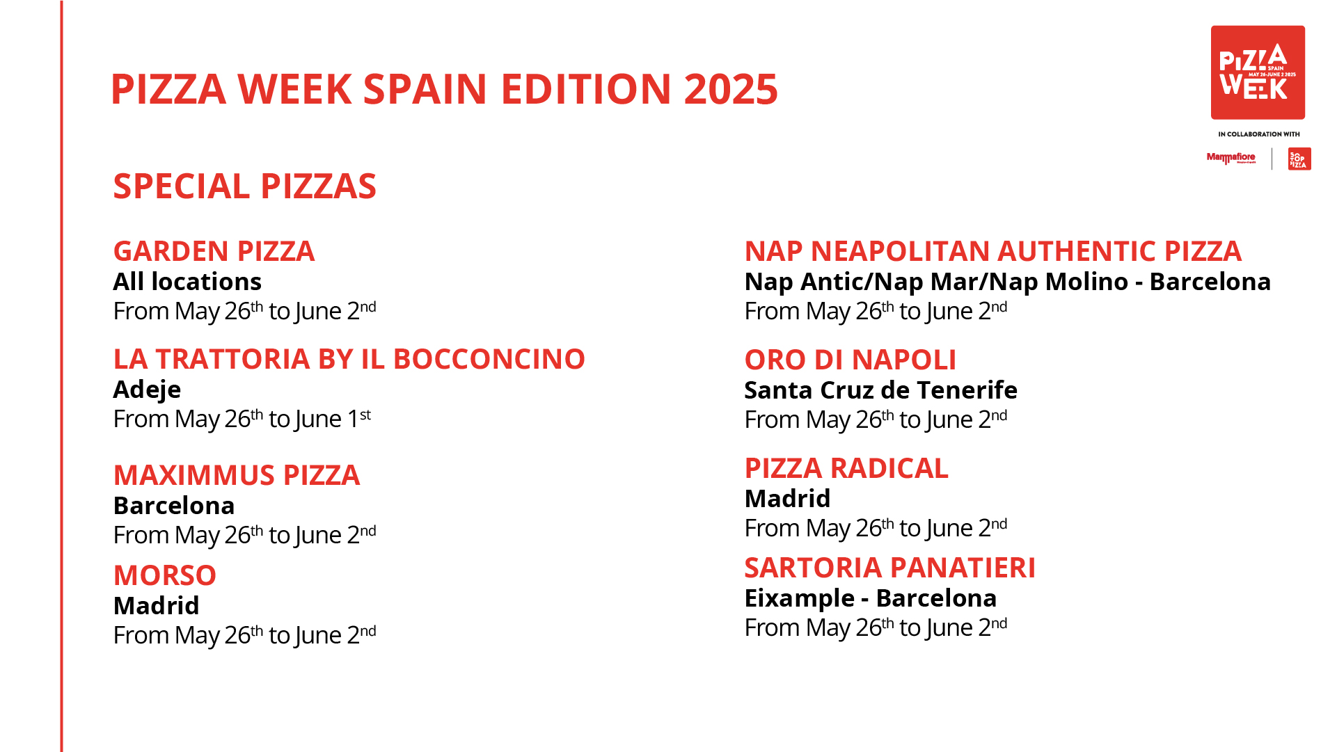 Torna a: Pizza Week Spain Edition 2025: dal 26 maggio al 2 giugno