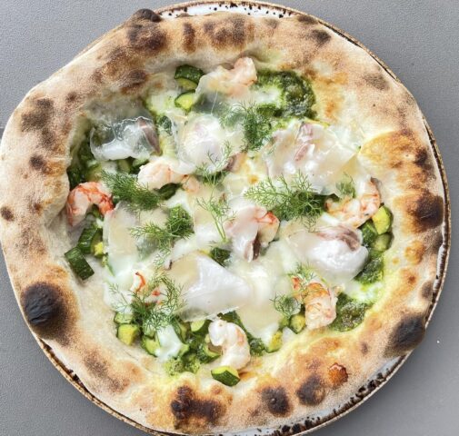 Pizza Mediterranea: fior di latte, alici di Cetara, datterini gialli e rossi al forno, pesto di basilico.