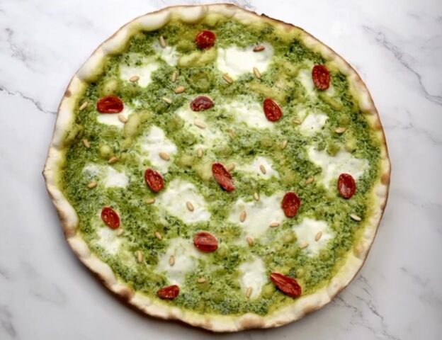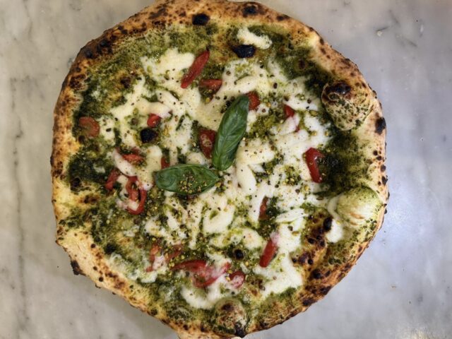 Pizza Pesto: fior di latte, pesto di basilico, pomodorini, parmigiano reggiano.