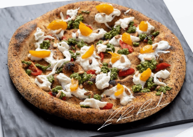 Pizza Futura: glassa di pomodoro San Marzano, pomodorini semi secchi, pesto di basilico, mozzarella di bufala fiammata, olio al basilico.