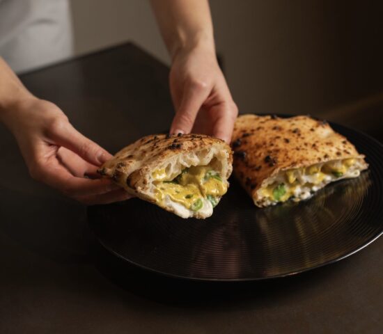 Calzone Innovativo: calzone in doppia cottura (400° e poi a 270°) farcito di ricotta di bufala fermentata, fave marinate in osmosi, pesto di fave, maio ai capperi e provola.