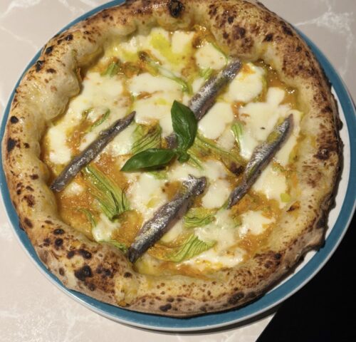 Carcioffola: crema di carciofi, fiordilatte, spicchi e carpaccio di carciofi, bacon croccante, carciofo grigliata, pecorino crotonese grattugiato, prezzemolo.