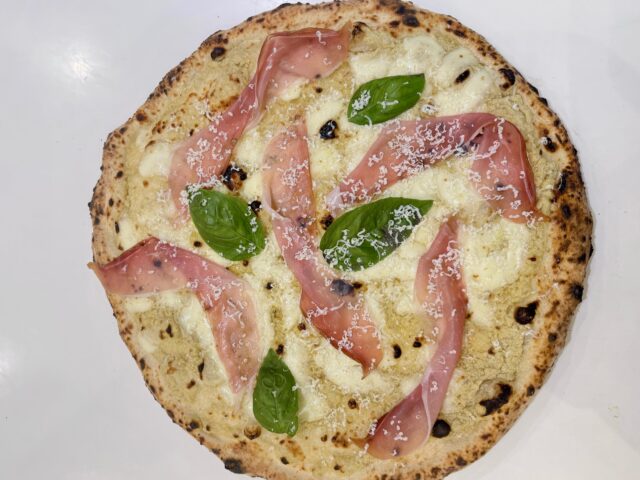 La Special “Speck e Carciofi”: fiordilatte, crema di carciofi, speck, olio e scaglie di cacioricotta di pecora (la versione senza glutine è disponibile solo nella sede di Salerno).