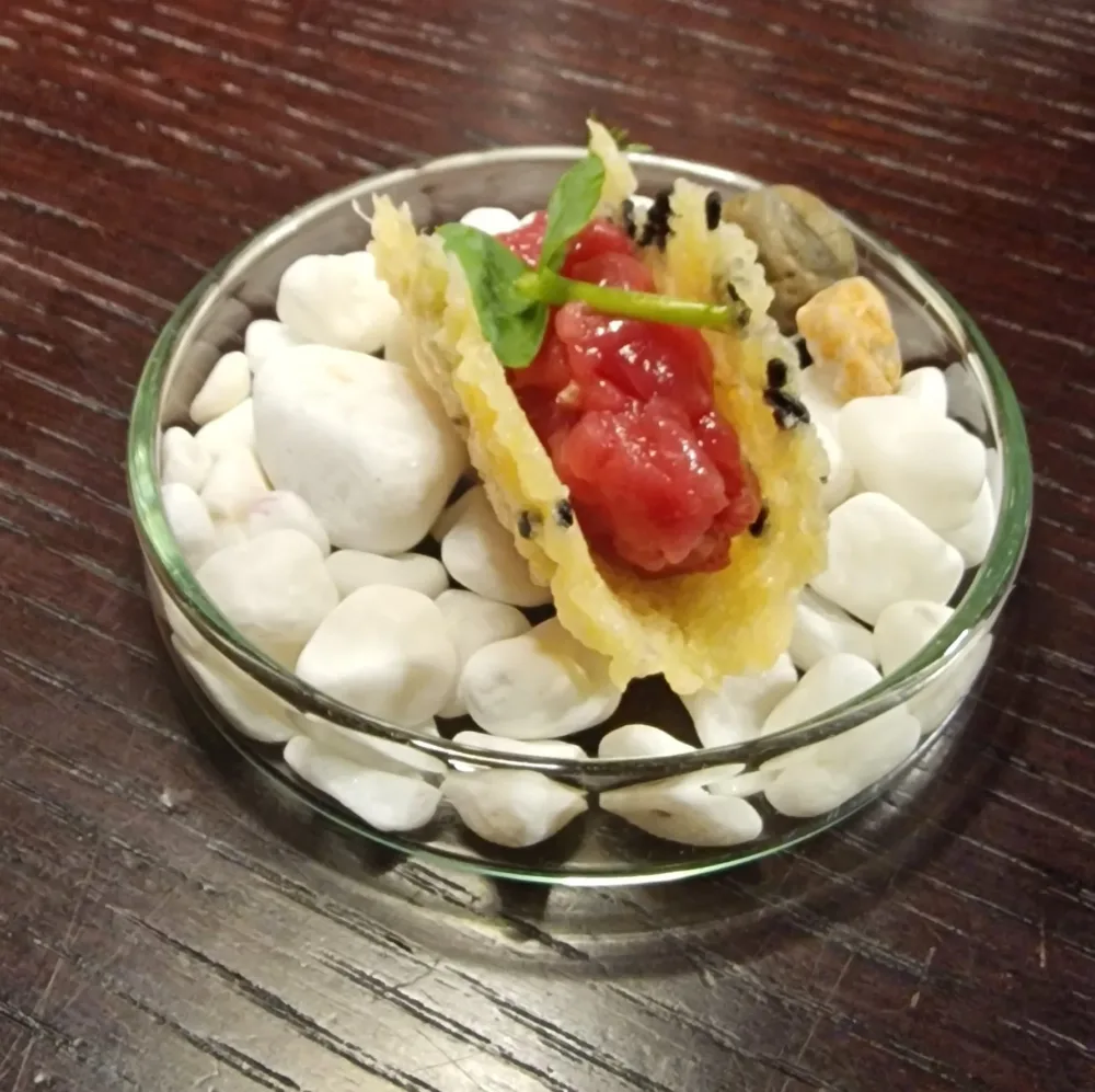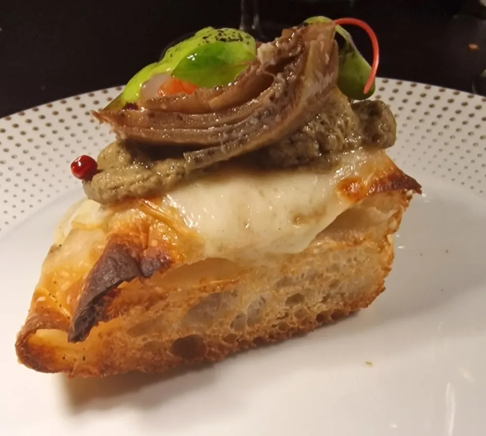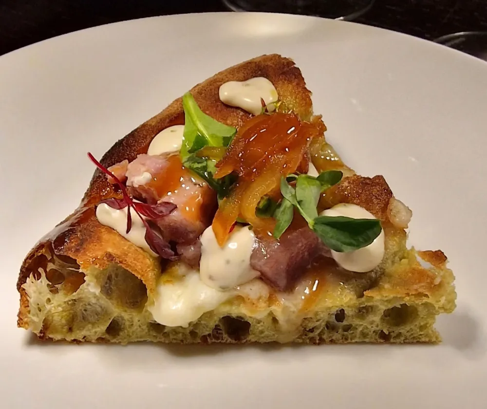 Tarte-Ton (Francesco Pompetti) Omaggio a Mauro Uliassi, visto che Francesco ha lavorato nella sua cucina come pastry chef. Farina Oro Macina. Pizza da uno spiccato contrasto dolce e salato: un incrocio tra una tarte tatin ed una tartare di tonno. Imposto a lievito mare con plancton marino ed acqua di mare, topping con tartare di tonno, mela in osmosi, caramello, maionese alle acciughe e succo di mela verde. Utilizzato il suo lievito madre di 9 anni.