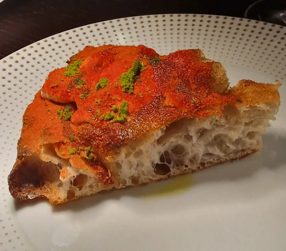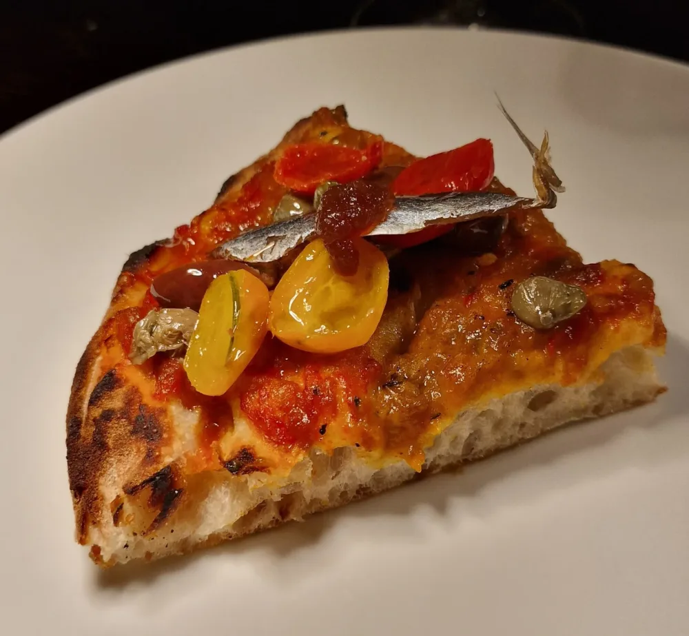 Fondamentale di Marinara (Pietro Fontana). Veniamo ad una pizza in pala fatta con lievito madre e 90% d’idratazione. Il risultato dell’impasto una volta cotto é croccante all’esterno e soffice all’interno. Sono utilizzate farina di tipo 0 Tramonti e multi cereali Oro Macina. Il topping è un fondendte di peperoni rossi e datternio rosso, fondente di peperone giallo e datterino giallo, olive nere e capperi al forno,pomodori semi dry, origano fresco, gel di peperone agrodolce all’aceto di lamponi ed alici marinate al sale ed erbe aromatiche.