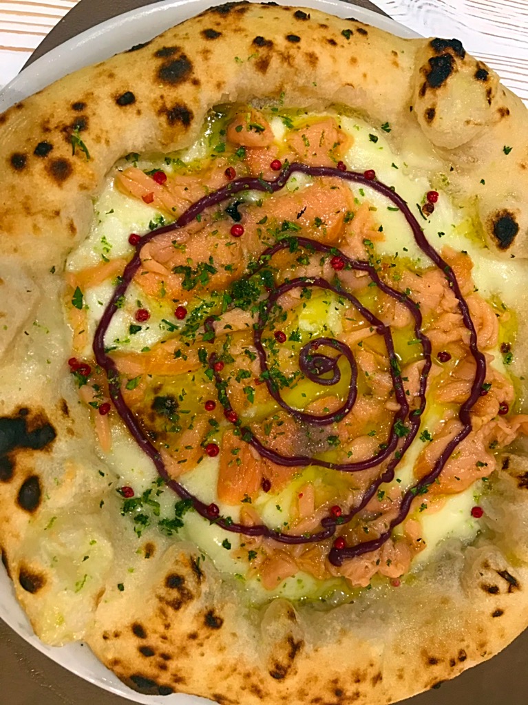 Confesso di non amare le pizze con il pesce ed in genere non le scelgo. Questa volta però sono stata tentata dalla proposta extra menù: la Chiaia a Mare, farcita con salmone scozzese marinato, pepe rosa, riduzione di aglianico, lime, prezzemolo, fior di latte e olio extravergine bio. Una pizza creativa, raffinata al gusto e dove gli ingredienti sono in equilibrio.