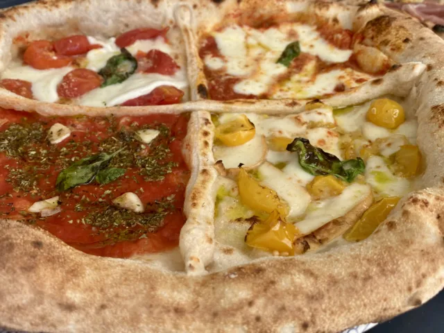 4-Pomodori: piennolo rosso, piennolo giallo, corbarino, San Marzano Dop, provola affumicata di Agerola, fiordilatte di Agerola, mozzarella di bufala Dop, origano, aglio dell’Ufita, olio extravergine.