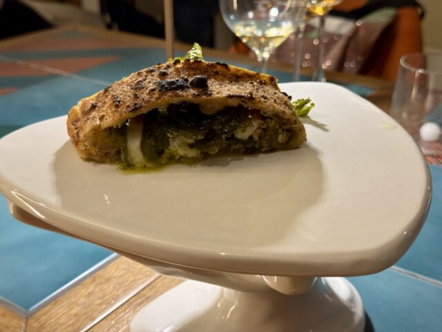 Partiamo dalla base, cioè l’impasto indiretto, tecnicamente ineccepibile, ottenuto con un blend di farine con una percentuale di crusca che gli conferisce un colore bruno, per una pizza dallo stile napoletana che si apre a visioni contemporanee. Il percorso di degustazione è composto da cinque portate, con un susseguirsi di pizze presenti in menù e preparazioni fuori carta, pensate per accompagnare il cliente in un viaggio attraverso il mondo di Francesco Calò: fatto di viaggi, sperimentazioni e tanta tenacia. Racconti di territori e di biodiversità che si incrociano sulla pizza, con omaggi alla sua Puglia e alla Campania. Tra le “segnature”, spicca la “Tre consistenze di friarielli”, una pizza richiestissima da restare sempre in carta anche fuori stagione. La verdura, infatti, arriva da una fattoria pugliese che si è impegnata a garantire la disponibilità tutto l’anno.