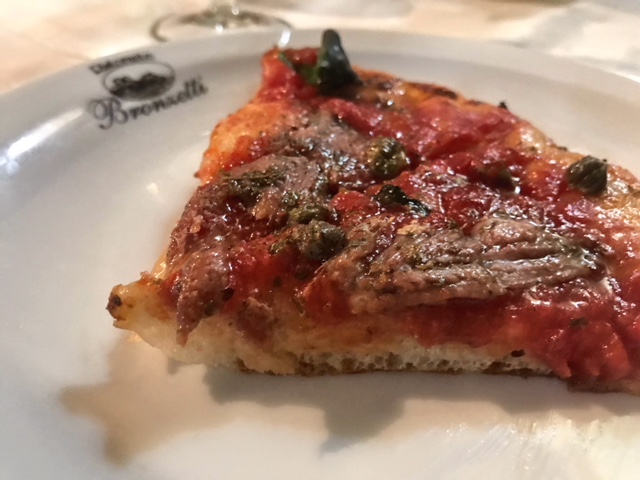 Mario Cau, nipote di Anna Gentile – poprietaria della pizzeria Bronzetti – la ripropone nella versione classica, con doppia lievitazione ( la seconda direttamente nel ruoto) per complessive 24 ore, condita poi con pomodoro, acciughe dissalate, aglio e origano. La cottura avviene ( a bocca di forno ) nel forno a legna. Una vera bontà al quale sarà difficile resistere.