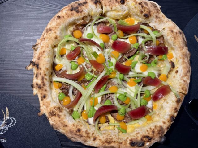 Cosa aspettarsi da questa nuova proposta? umami, salato, dolce, amaro e acido: i cinque recettori del gusto convivono armoniosamente, accompagnati da consistenze che spaziano dalla morbidezza alla cremosità, il tutto senza trascurare l’importanza della componente visiva. C’è sicuramente equilibrio, ma il di là del gusto personale, la pizza meno facile da affrontare rimane “Come un brodo”, dove il profumo e il sapore della carne cotta in brodo potrebbe non incontrare i gusti di tutti. Al contrario, Asparagus e Tre consistenze di piselli conquistano la scena, mentre a chiudere il percorso arriva Tonno allagato, esempio didattico dell’incontro tra dolce, sapido e amaro in un solo morso.
