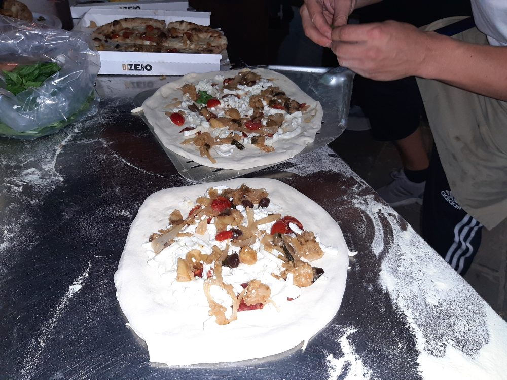 Alla fine della serata ecco qui una generosa offerta di pizze da parte di Da Zero di tutti i tipi ed in modo particolare proprio quella con la cipolla di Vatolla con fiordilatte, melanzane, patate, olive, cappeti, pomodorini, origano, salsiccia piccante e basilico.