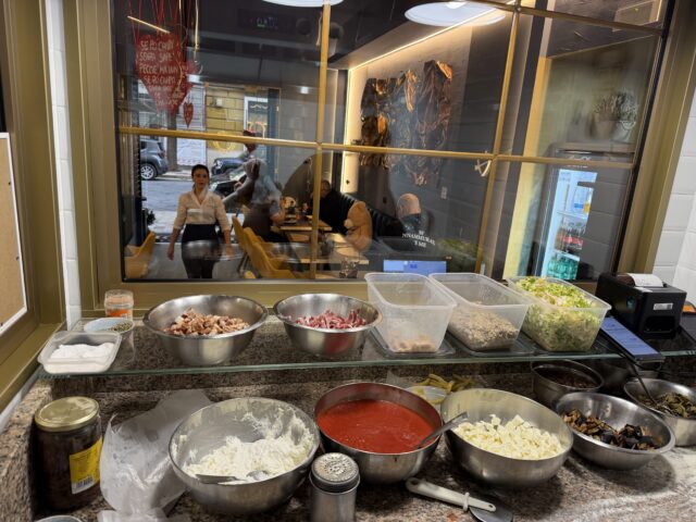 La friggitoria di Caserta interpreta questa eredità con un linguaggio attuale. Il locale è moderno e accogliente, pensato per offrire comfort: circa quaranta coperti, tra sedute tradizionali, sgabelli e divani, in un ambiente che guarda alle pizzerie contemporanee senza rinnegare le proprie radici.