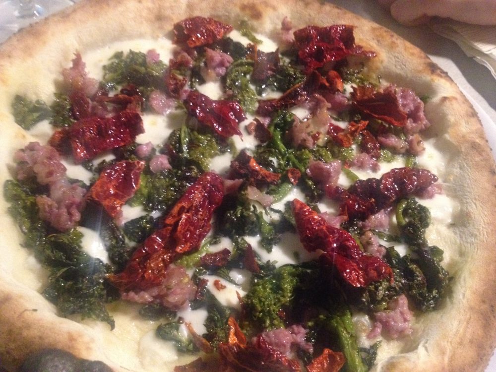 Una pizza con broccoli ( i primissimi della stagione), salsiccia e peperone crusco, davvero squisita e una margherita a cui mancava un pizzico di olio in più a crudo. “Purtroppo la gran parte dei clienti, non amano sentire il gusto di un olio di qualità, amaro e piccante”, ci racconta Antonio e capisco sempre più che far capire un olio di qualità è una battaglia ancora da vincere.